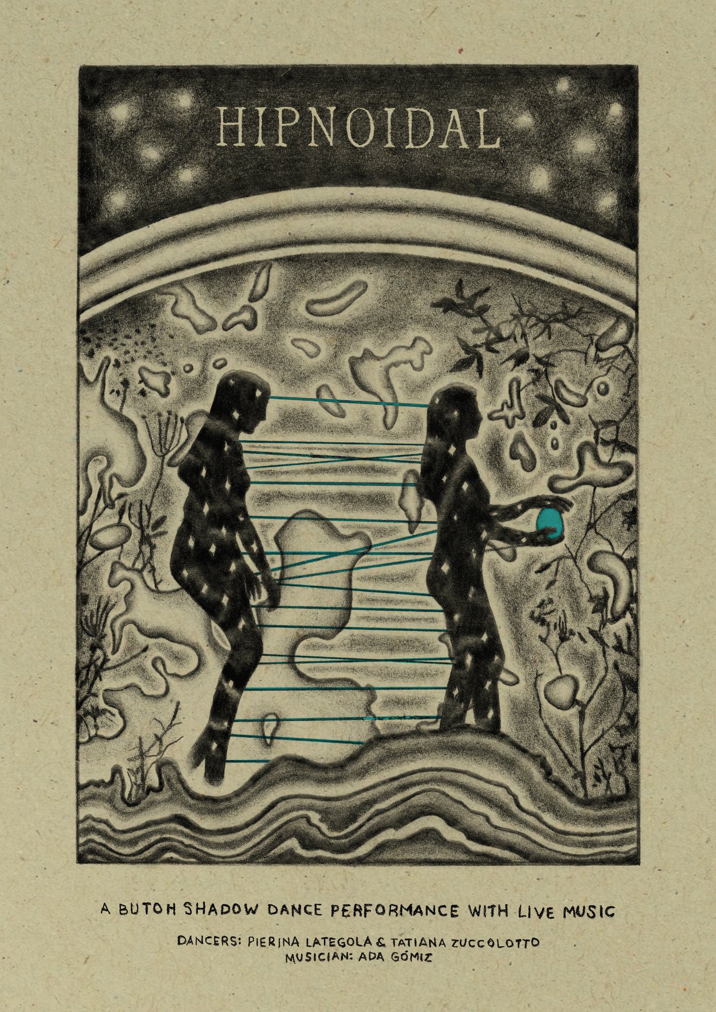Hipnoidal er et tværfagligt værk, der kombinerer butoh-dans, skygge-teater og live musik, som fremkalder en tilstand mellem drøm og vågenhed. Fra dette mellemrum søger vi at dykke ned i underet ved det levende, og udforske forbindelsen til flygtige territorier, elementale kræfter og den krop, der krydser minder for at udvide det, vi opfatter som verden, som selvet, som den anden.